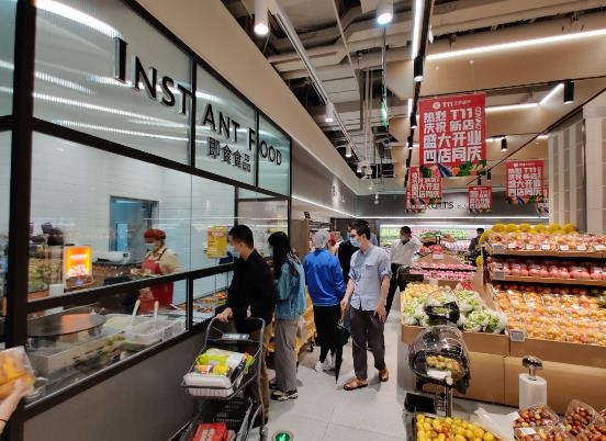 與前三家面積在4000多平米左右,SKU達7000多,位于商場或社區內的門店相比,9月23日試營業的T11國奧中心店則是社區型的臨街門店。在不足1000平的門店里,圍繞當地商圈社區居民一日三餐的家庭生活場景而打造的4000多SKU的T11國奧店,簡潔而不簡單。