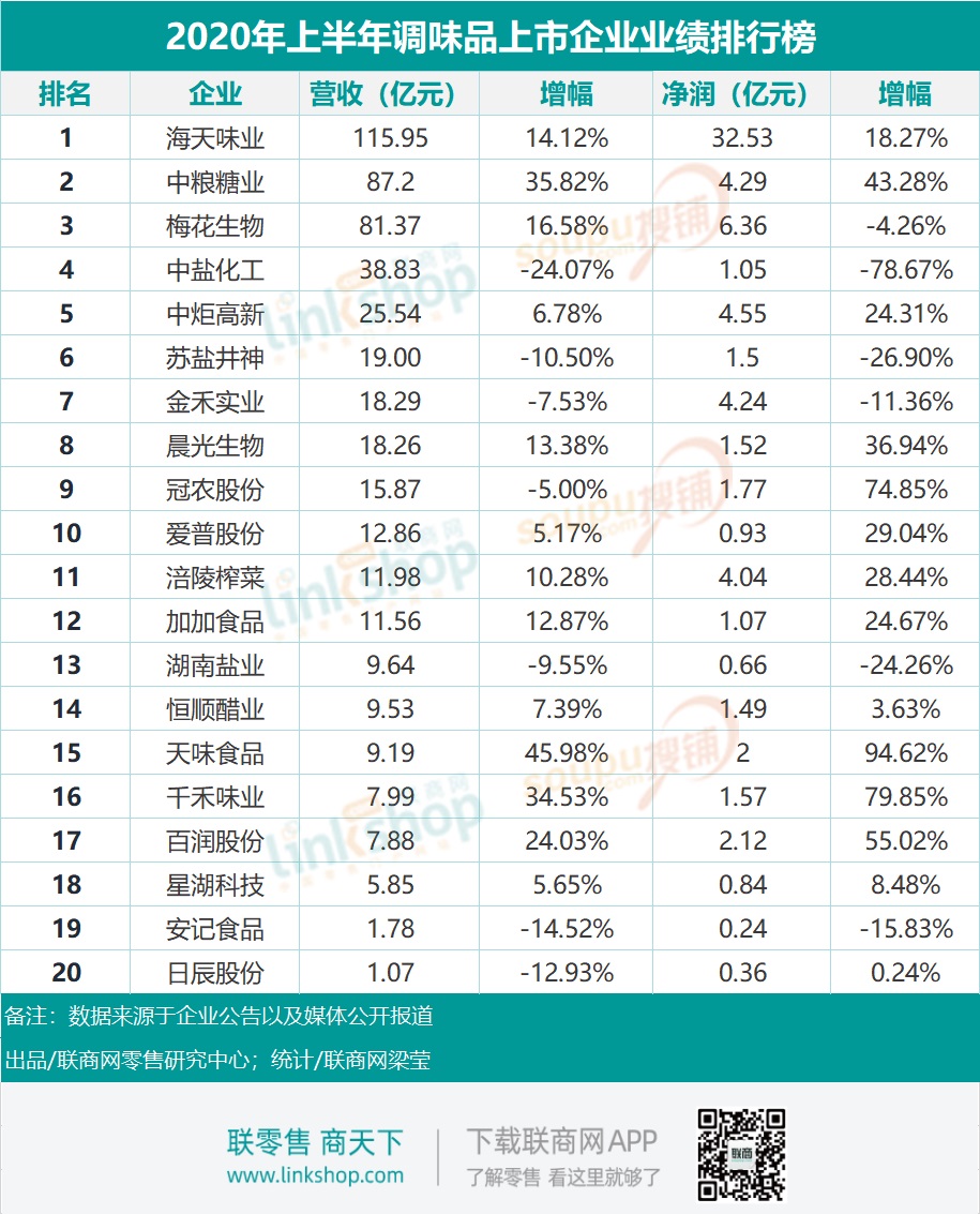 據(jù)聯(lián)商網(wǎng)零售研究中心不完全統(tǒng)計(jì),海天味業(yè)、中糧糖業(yè)、梅花生物、中鹽化工、涪陵榨菜、加加食品、恒順醋業(yè)、天味食品、千禾味業(yè)等20家上市調(diào)味品企業(yè)2020年上半年?duì)I收總額約為484億元,平均營(yíng)收約為24億元。
