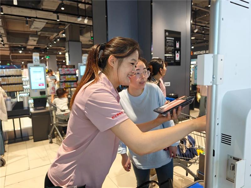 在北京鴻坤廣場(chǎng)店客流高峰時(shí)段,收銀支援員工王麗正嫻熟地疏導(dǎo)著排隊(duì)人群。“您好,這邊可以結(jié)賬,請(qǐng)跟我來!”她面帶微笑,用清晰有力的指引聲,將推著滿載購物車的顧客分流至不同收銀通道。面對(duì)持續(xù)涌入的顧客,王麗始終保持著專業(yè)的工作節(jié)奏,一邊快速判斷各通道結(jié)賬進(jìn)度,一邊及時(shí)補(bǔ)位支援。這看似重復(fù)的引導(dǎo)工作,實(shí)則是保障顧客購物體驗(yàn)的關(guān)鍵環(huán)節(jié)——正是這些基層員工日復(fù)一日的專業(yè)服務(wù),構(gòu)筑起超市高效運(yùn)轉(zhuǎn)的服務(wù)基石。