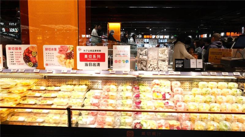 在永輝,鮮度與價格形成透明對話。貨架上的折價標簽不再是模糊的促銷手段,而成為鮮度變化的品質坐標,商品經歷價格調整時,時間與原因清晰標注,構建起透明的鮮度追蹤機制。而針對果切這類“嬌貴”商品,四小時后打上八折標簽,六小時則進入六折區間,八小時后果斷撤離貨架。這種將時間價值化的管理機制,讓消費者在挑選時多了一份安心。“上次買的打折的果切,口感依然清甜如初。”一位顧客分享道。