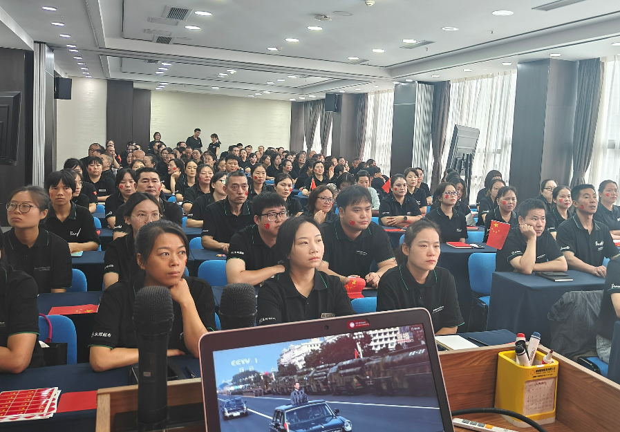 閱兵式開始后,員工們全神貫注,感受人民軍隊的威武雄壯、國之重器的磅礴氣勢,現場跟唱國歌,多次響起自發掌聲和歡呼,民族自豪感與企業榮譽感在每一位員工心中激蕩